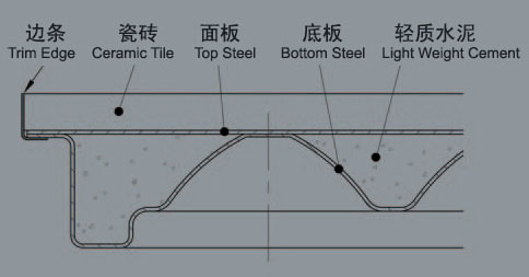 由瓷磚、鋼基殼體等組成。殼體由面板、底板、發(fā)泡水泥等組成。面板、底板采用優(yōu)質(zhì)鋼板,經(jīng)沖壓、焊接、內(nèi)外磷化處理、表面噴塑等工藝制成殼體,內(nèi)腔填充發(fā)泡水泥。地板完成高度最低為70mm。采用特殊優(yōu)質(zhì)的防靜電瓷磚,即可具備防靜電性能。
